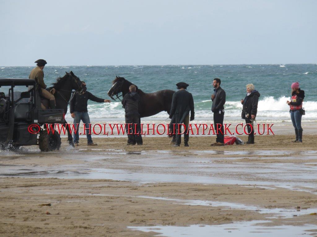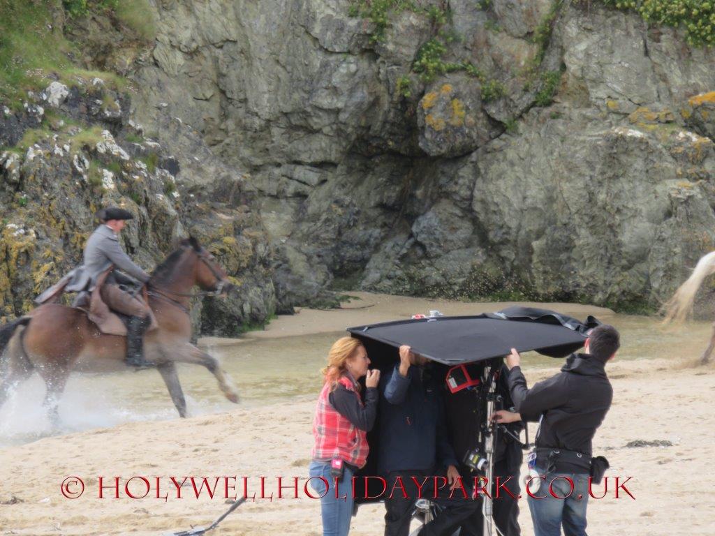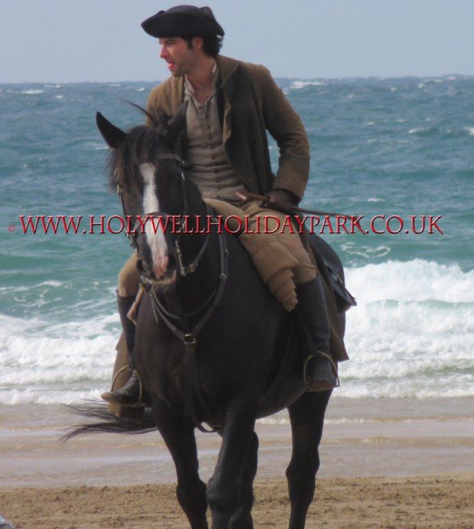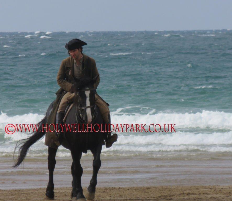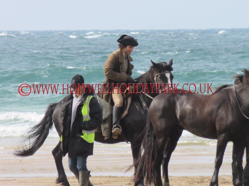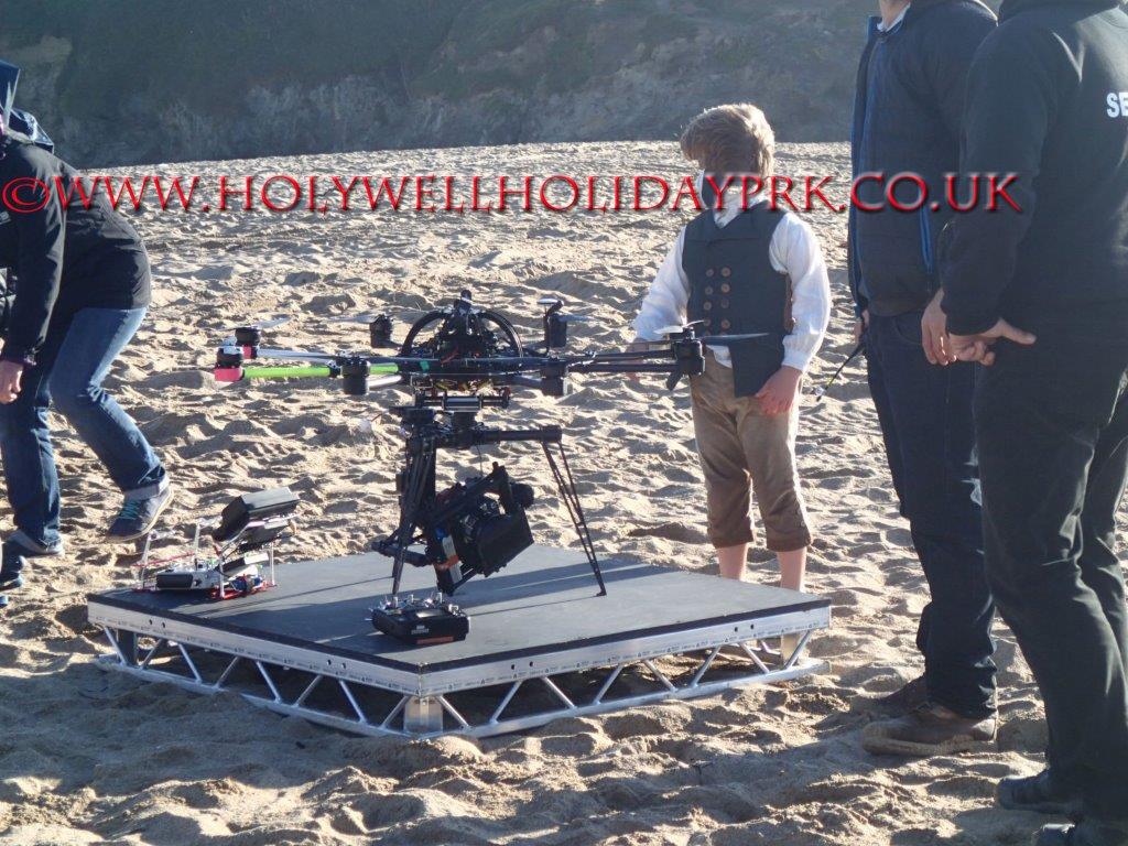 Aiden Turner as Ross Poldark. Luke Norris as Dr. Dwight Enys and Gabrielle Wilde as Caroline Penvenen were all on Holywell Bay Beach, Newquay, filming Poldark series 2. “The Drone” with all its cameras they say cost in the region of £50,000.
